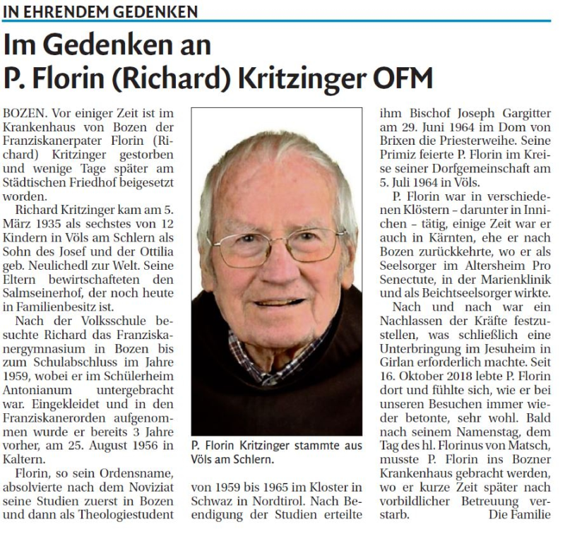 Lieber Onkel Richard - Pater Florin Danke ! Vergeldsgott für alles das Wiedersehen mit deinen dir vorausgegangenen Brüdern Engelbert und Sepp möge dich erfreuen. Schicke uns weiterhin Schutz, Freude, Glück, Gesundheit und Segen Vergeldsgott! Ruhe in Frieden